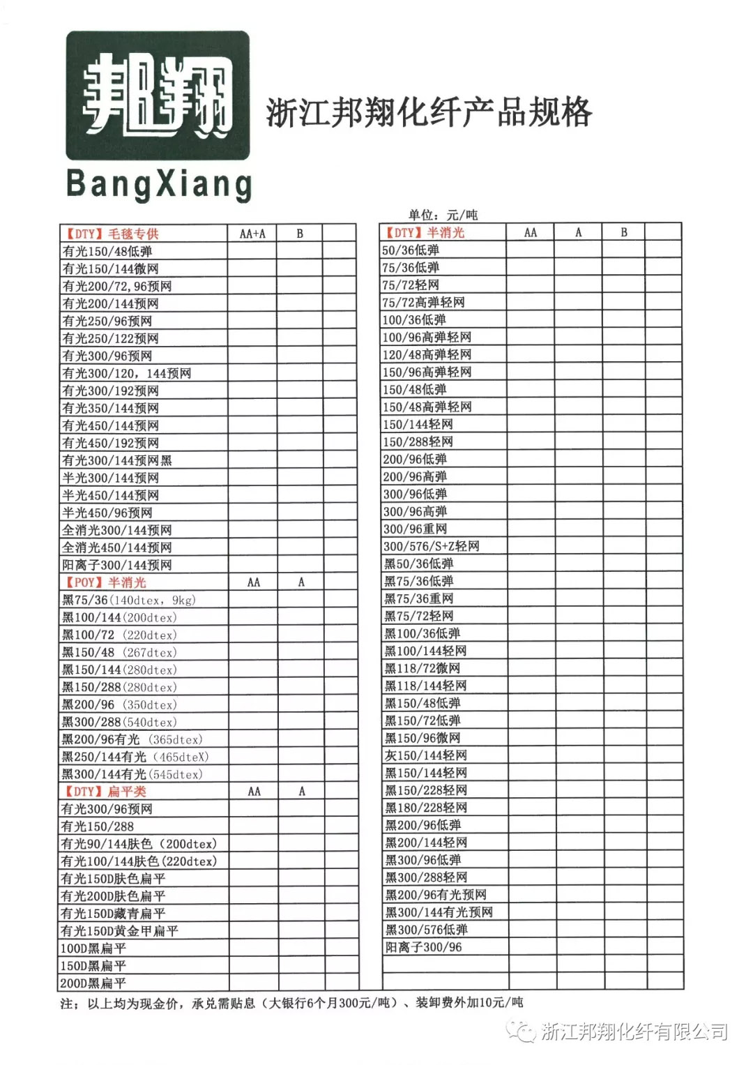 Zhejiang Bangxiang Holding Group Produktspecifikation Tabell-PRODUKTLISTA